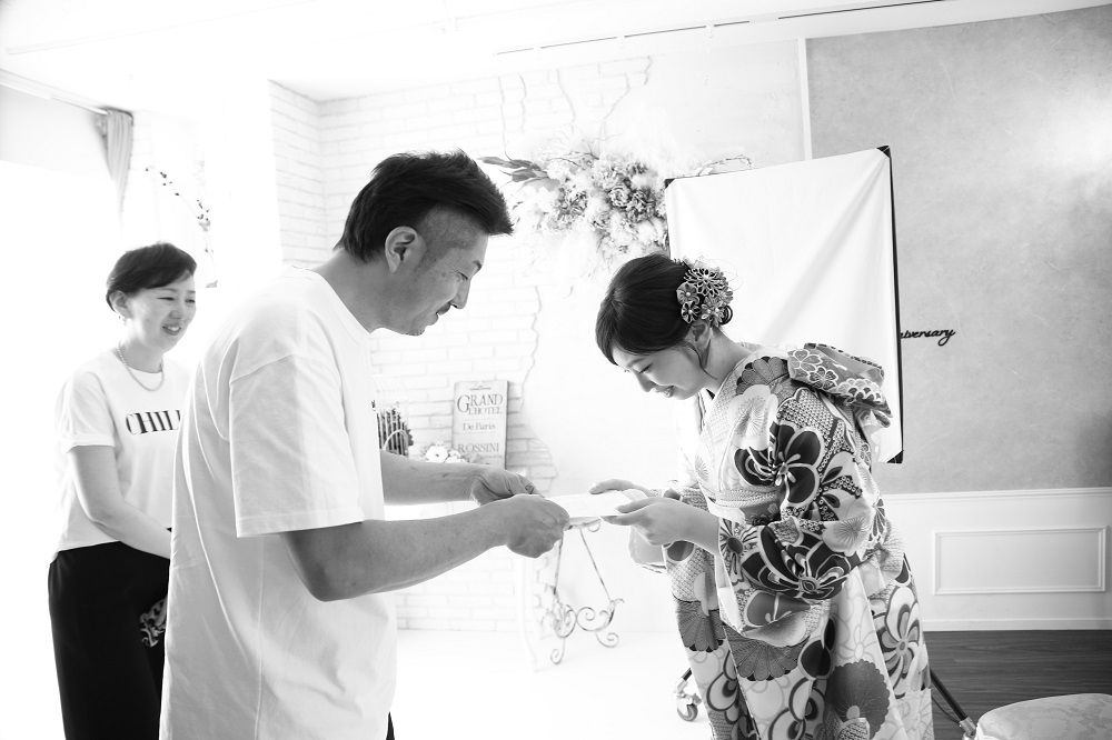 結手紙を渡すタイミングは、ファーストコレクションの「家族成人式」のように、前撮り時や成人式当日、あるいはその前後の、親子水入らずでゆっくりと話せる瞬間が最も心に響きます。渡し方も、サプライズ感を演出したり、感謝の言葉を添えたりすることで、より感動的な体験となります。