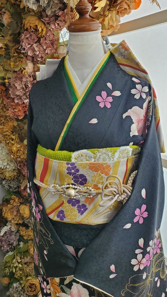 黒地の振袖は重くなりがち……と思われがちですが、ラメやオレンジの挿し色が加わることで、重たさを感じさせず、むしろモダンで洗練された印象に仕上がっています。