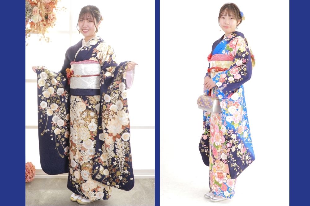 左:当店で最も人気カラーの紺地の振袖