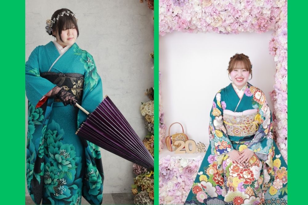 左:大花が印象的でモード系深緑地の振袖