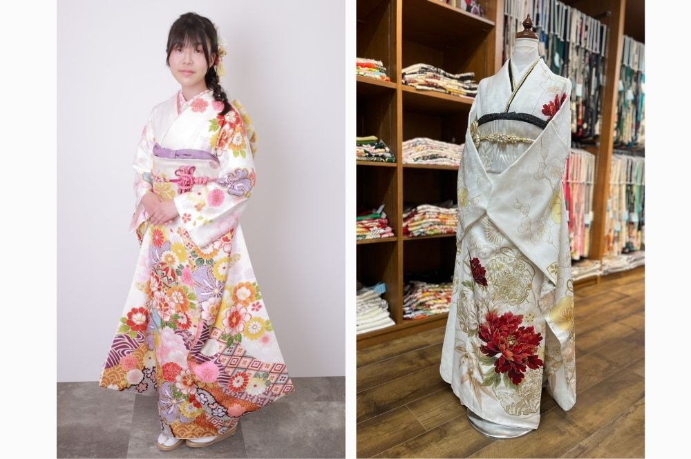 白地の振袖は「かわいい」「かっこいい」「個性派」と幅広いデザインが合います。