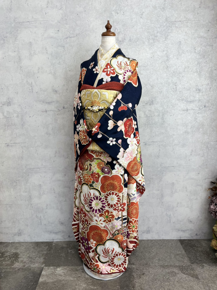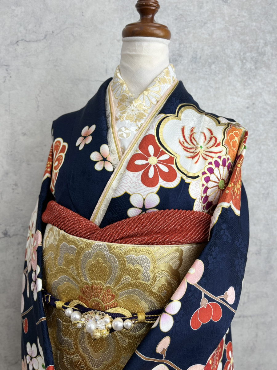 今週のイチオシ振袖コーディネート 深みネイビー×梅や菊の古典柄で大人の華やかさが光る振袖~本庄早稲田店