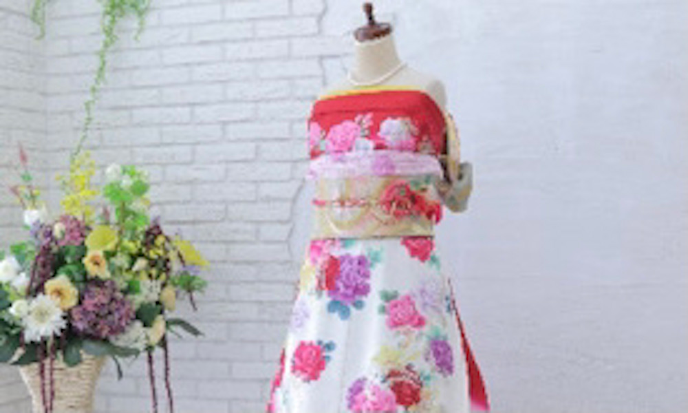 成人式用にお選びになった振袖一式を使ってドレス風にアレンジいたします。