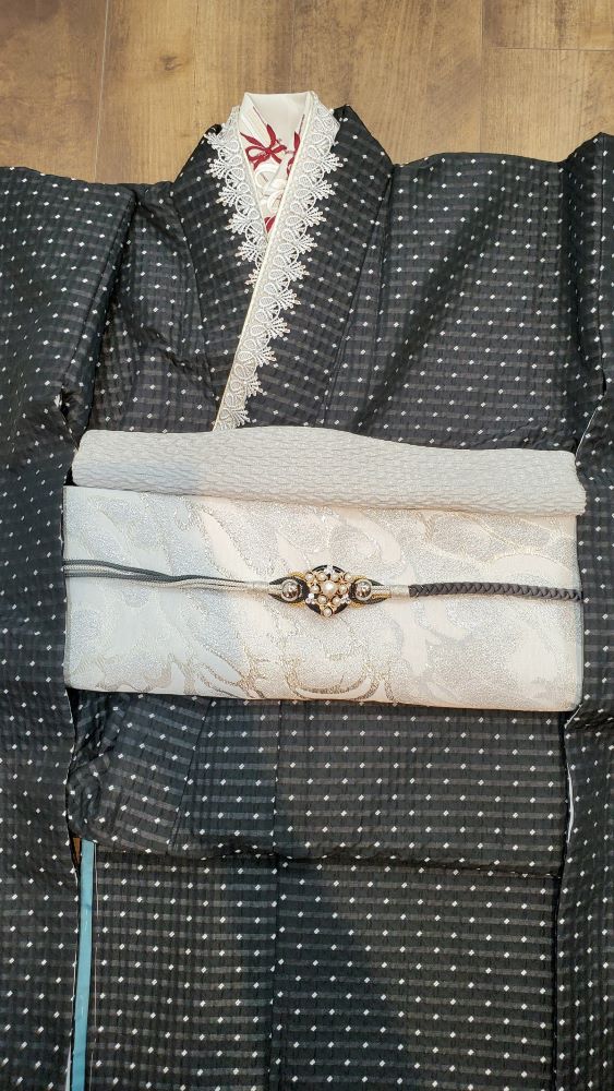 帯揚・・・上品にグレー系の帯揚を合わせました。色物を入れると全体が締まり、白系を入れると上品なすっきりしたイメージにまとまります。