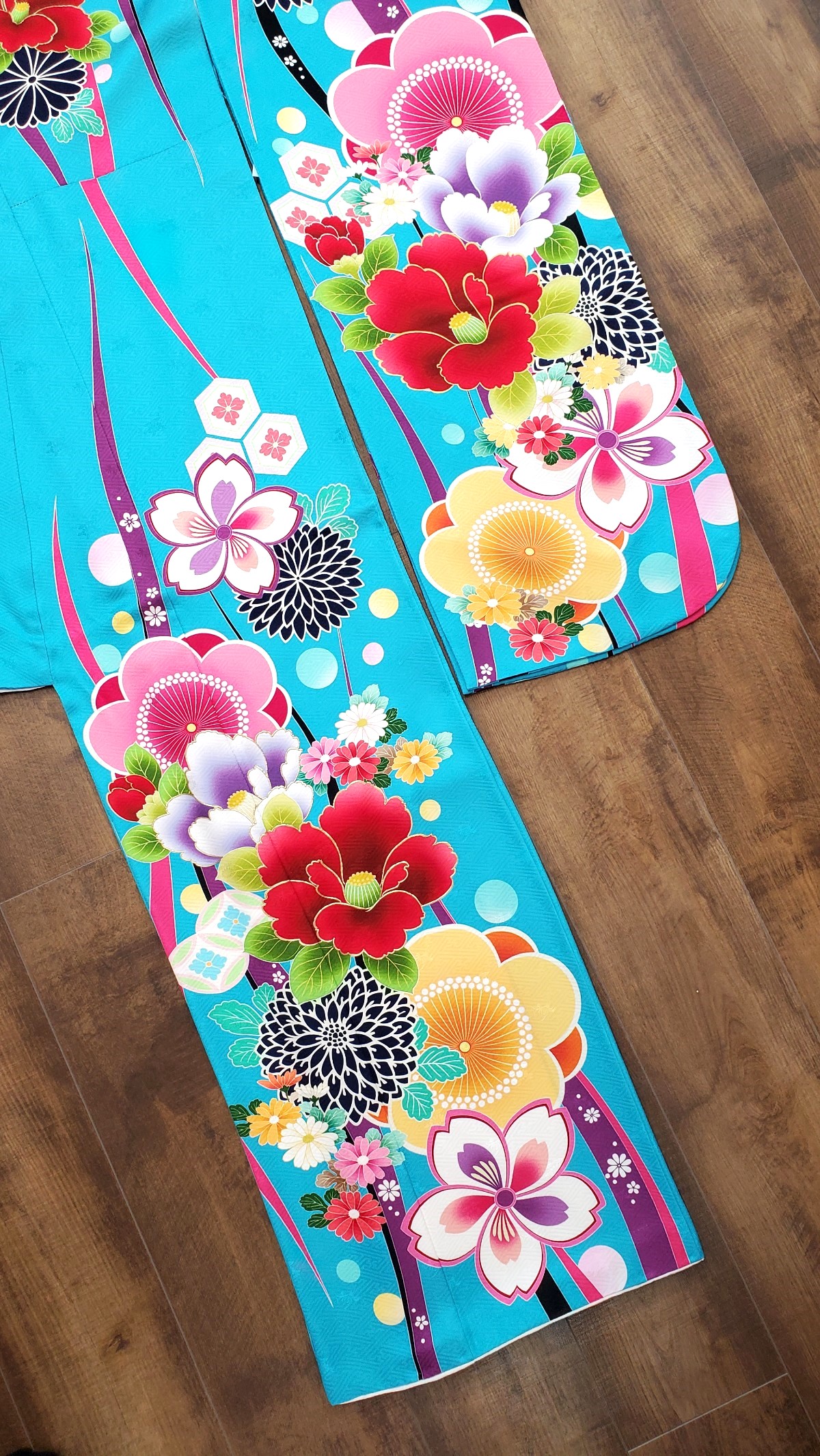 今時な大柄のお花が鮮やかな着物の色味と合っていて、華やかさのある振袖となっております。