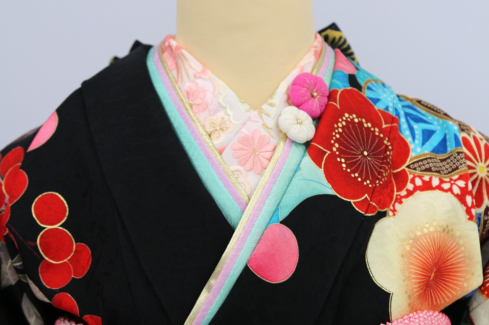 振袖の地色の黒が強いのでピンクで可愛らしい雰囲気に。