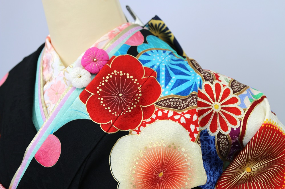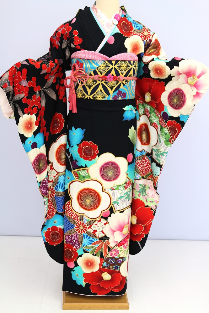 この振袖の最大の魅力は、力強い黒地と、そこに大胆に描かれた色とりどりの大輪の花々のコントラストです。
