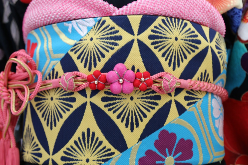 振袖の花の色とリンクするような赤や紫も取り入れられているので統一感もありつつ、帯自体の華やかさも際立っています。