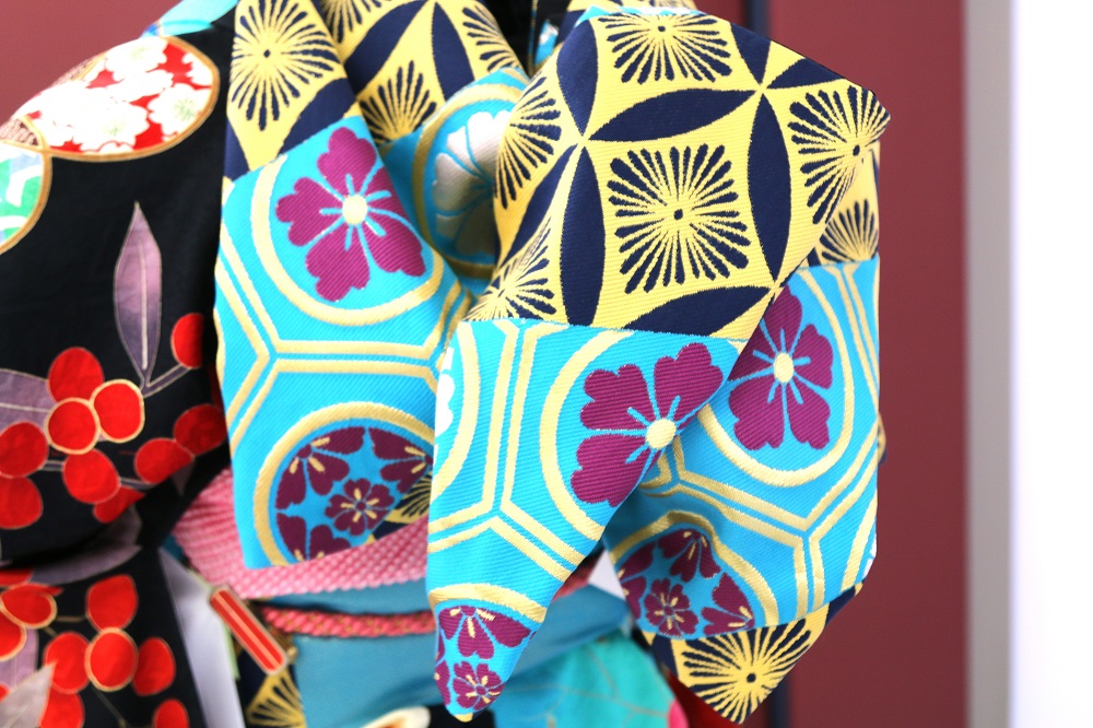 振袖の豪華さに負けないよう、黄色と水色がベースの菱や七宝などの吉祥模様が織り出された個性的な袋帯を合わせました。