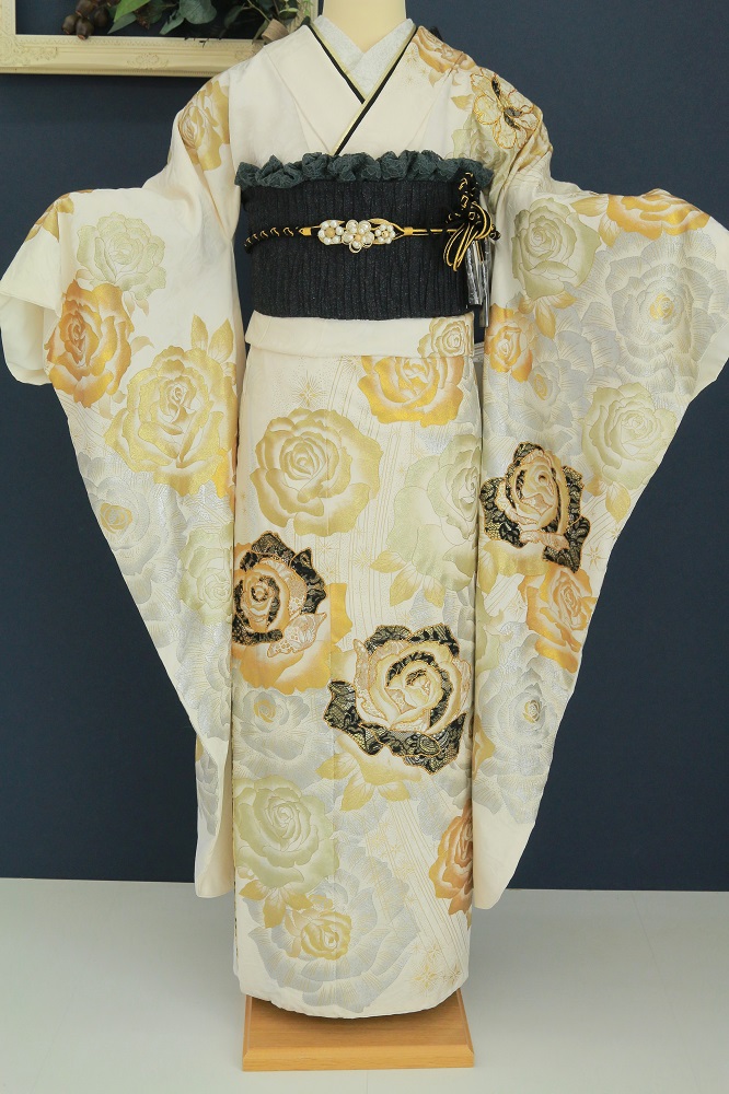 この振袖の最大の魅力は、その優美な薔薇の意匠にあります。白地に大輪の薔薇が描かれており、洋花でありながら、和装に昇華されることで、独特の奥ゆかしさとモダンな雰囲気を醸し出しています。