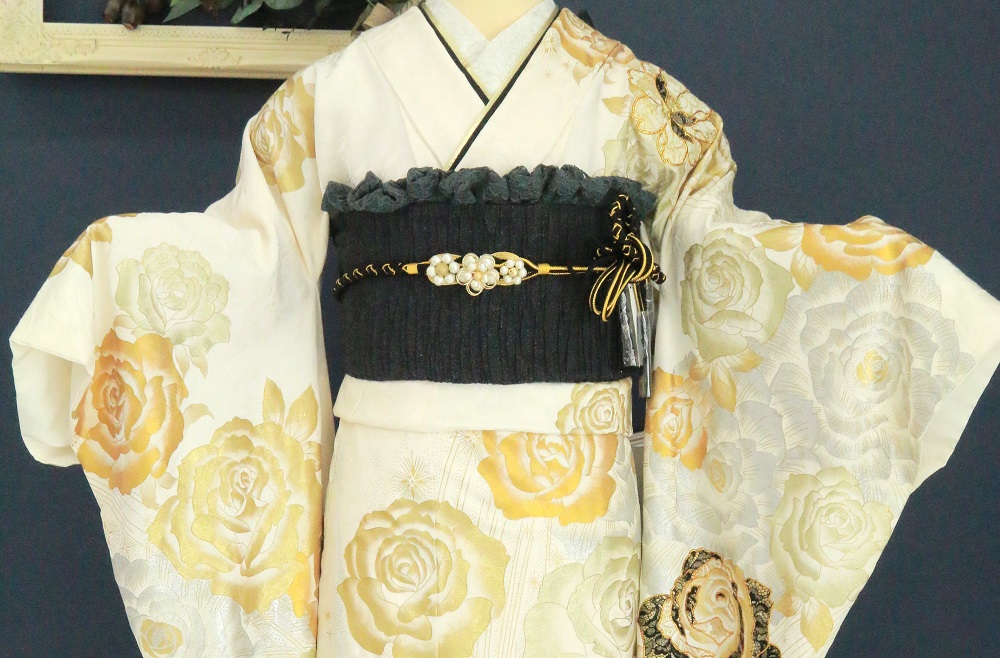 振袖の白と薔薇のグラデーションに対し、黒という引き締まった色の帯を加えることで、全体の印象にメリハリが生まれます。重厚な金糸が織り込まれ、振袖の金彩と響き合い、一層の華やかさを添えます。