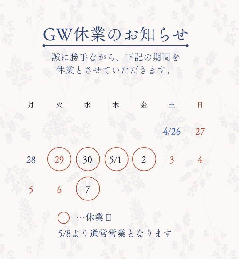 GWゴールデンウィーク中の営業に関して【4月29日・30日、5月1日~6日】